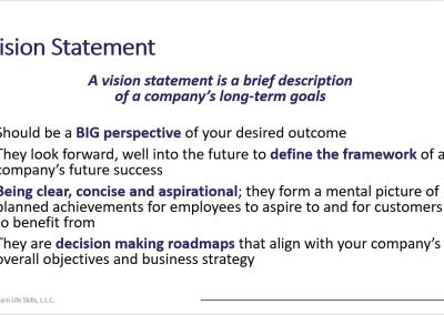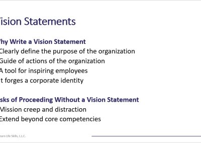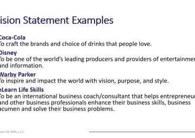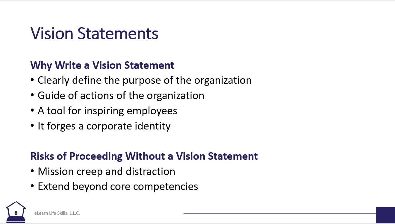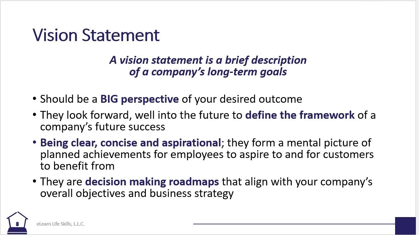 The vision statement is a decision-making roadmap that aligns with your company’s overall objectives and business strategy. It forges a corporate identity, guiding the actions of the organization. Develop a plan to communicate the company’s vision statement with employees. Without a vision statement, or one that is well-defined, the business risks mission creep and distraction, extending beyond the company’s core competencies.